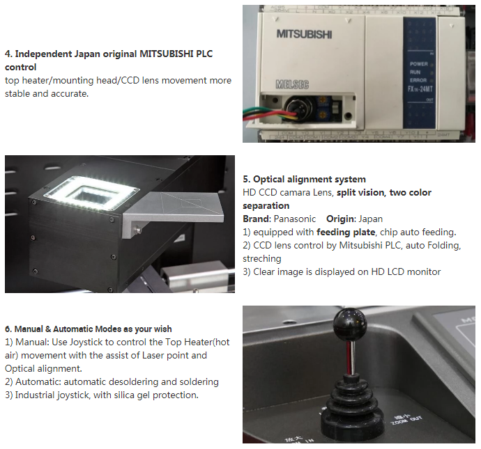 O : Postoje tri nezavisna grijača. Top topli vazduh + donji vazduh + platforma za infracrveno predgrevanje . Gornji i donji dio se mogu pomicati gore / dolje. To može učiniti grijanje fokusiranim i ravnomjernim. Efikasno povećati stopu prerade .